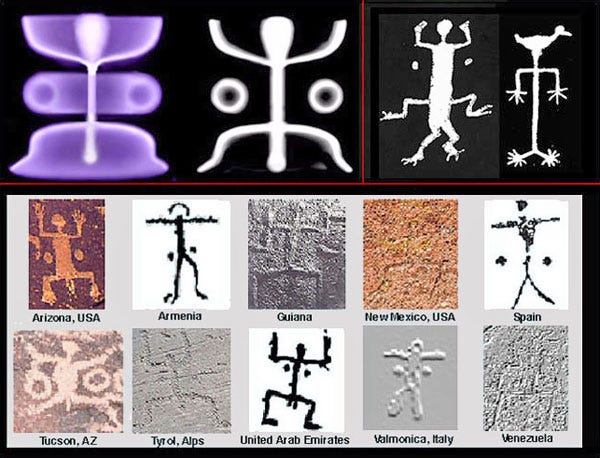 The similarity between ancient petroglyphs and modern depictions of plasmoids is compelling. In particular, the purple plasma structures from the upper section of the provided image bear a remarkable resemblance to the petroglyphs of humanoid figures found in places as disparate as Arizona, Armenia, and Italy. Could it be that these cultures, separated by vast distances, were all witnessing the same plasma phenomena in the skies?