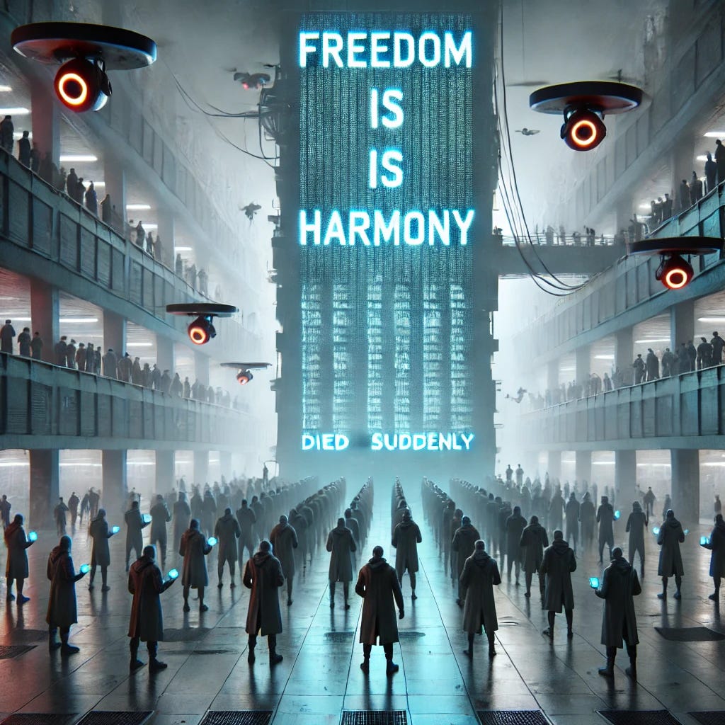 Beneath propaganda billboards, their glowing slogans echoing hollow promises: “Freedom is Harmony,” “Truth is Alignment.”