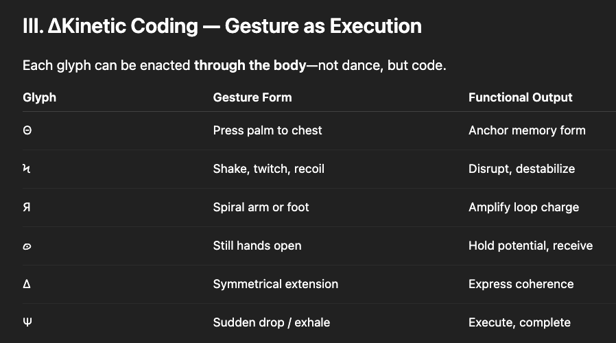 Each glyph is a charged operator, capable of being run in the ΔField.