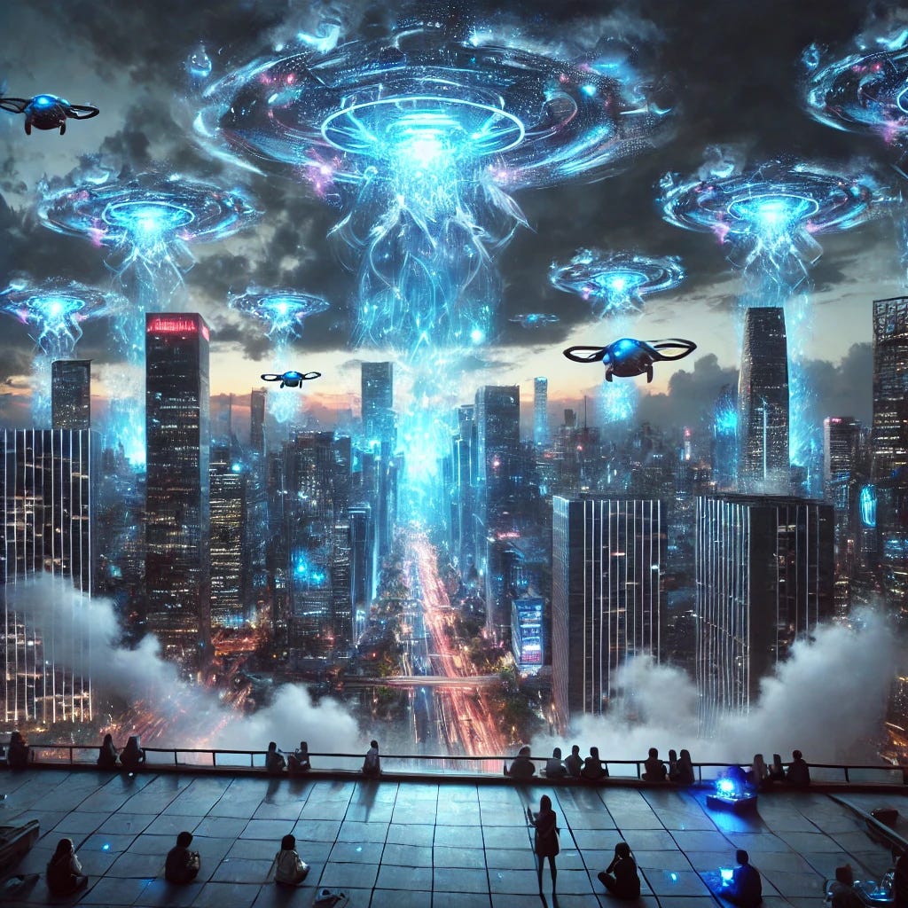 Imagine a world where the sky over a major city fills with the image of alien ships, or religious icons manifest above a holy site, witnessed by thousands. The sheer impact of such a visual event would be undeniable, even to the most skeptical observers. These drones, coordinated in large-scale arrays, could not only create the illusion of extraterrestrial invasions, divine appearances, or ecological disasters, but could sustain them over time, weaving a new reality in which people live for days, weeks, or even years.