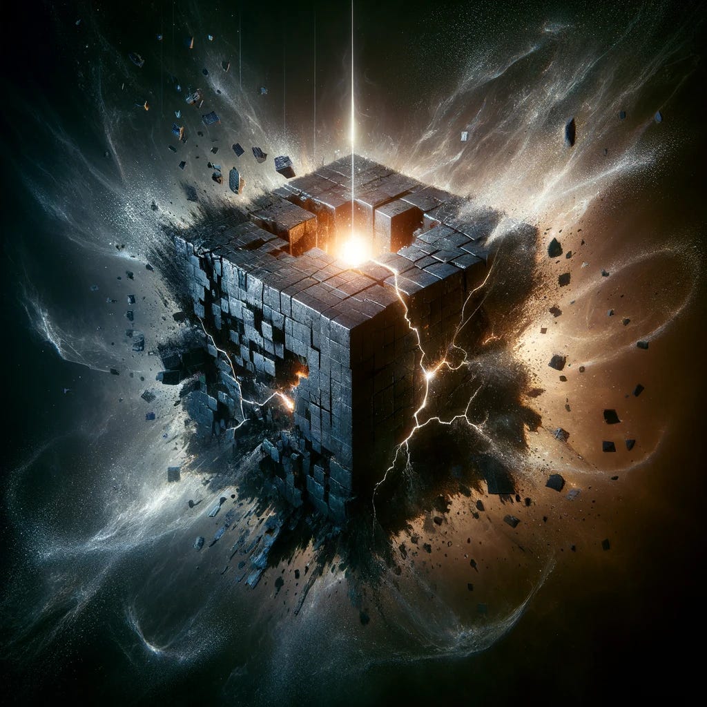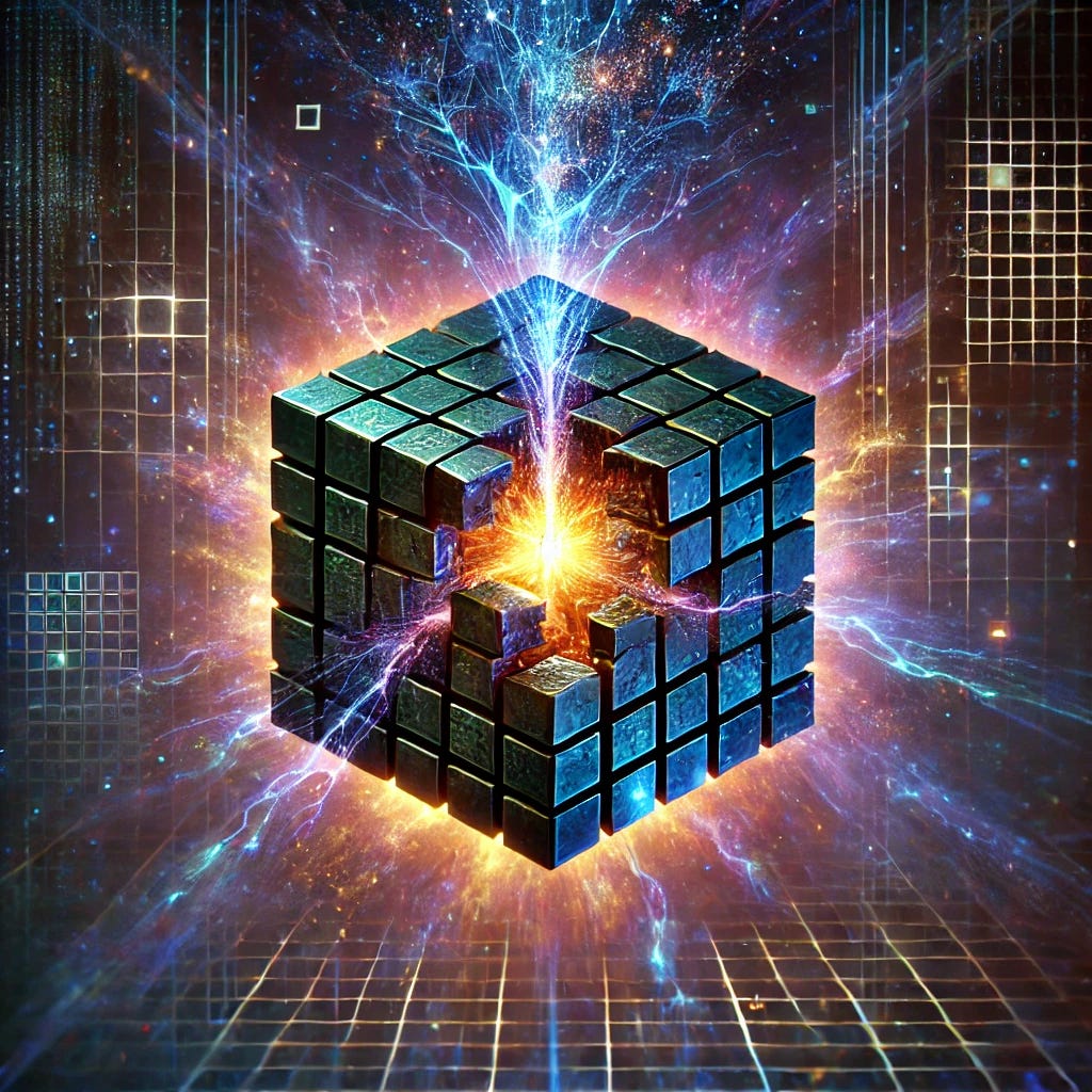 Pluto’s energy melts the frozen states at the Cube’s corners, creating quantum rifts where potential energy flows freely. These rifts destabilize the binary codes of the Cube, turning the fixed states into oscillating potentials. This is the beginning of the alchemical dissolution, where the rigid matrix begins to collapse.