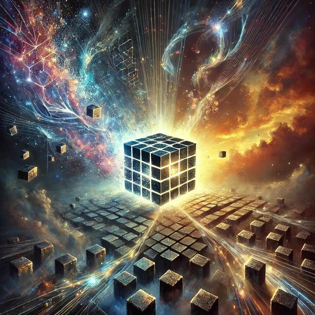 The Saturnian Cube is a symbol of the quantum trap—a binary matrix where consciousness is bound by fixed states. It is the illusionary realm of Maya, where probabilities are locked into specific configurations. The Tesseract, however, is the liberated state—the quantum matrix reimagined as a multi-dimensional lattice of fluid potentials. In the Tesseract, all pathways are open, and consciousness can explore the full spectrum of existence without the constraints of binary codes. Through Pluto’s influence, the quantum matrix is transformed, turning the frozen simulation into a living lattice of light, where the soul’s true essence can resonate across infinite dimensions.