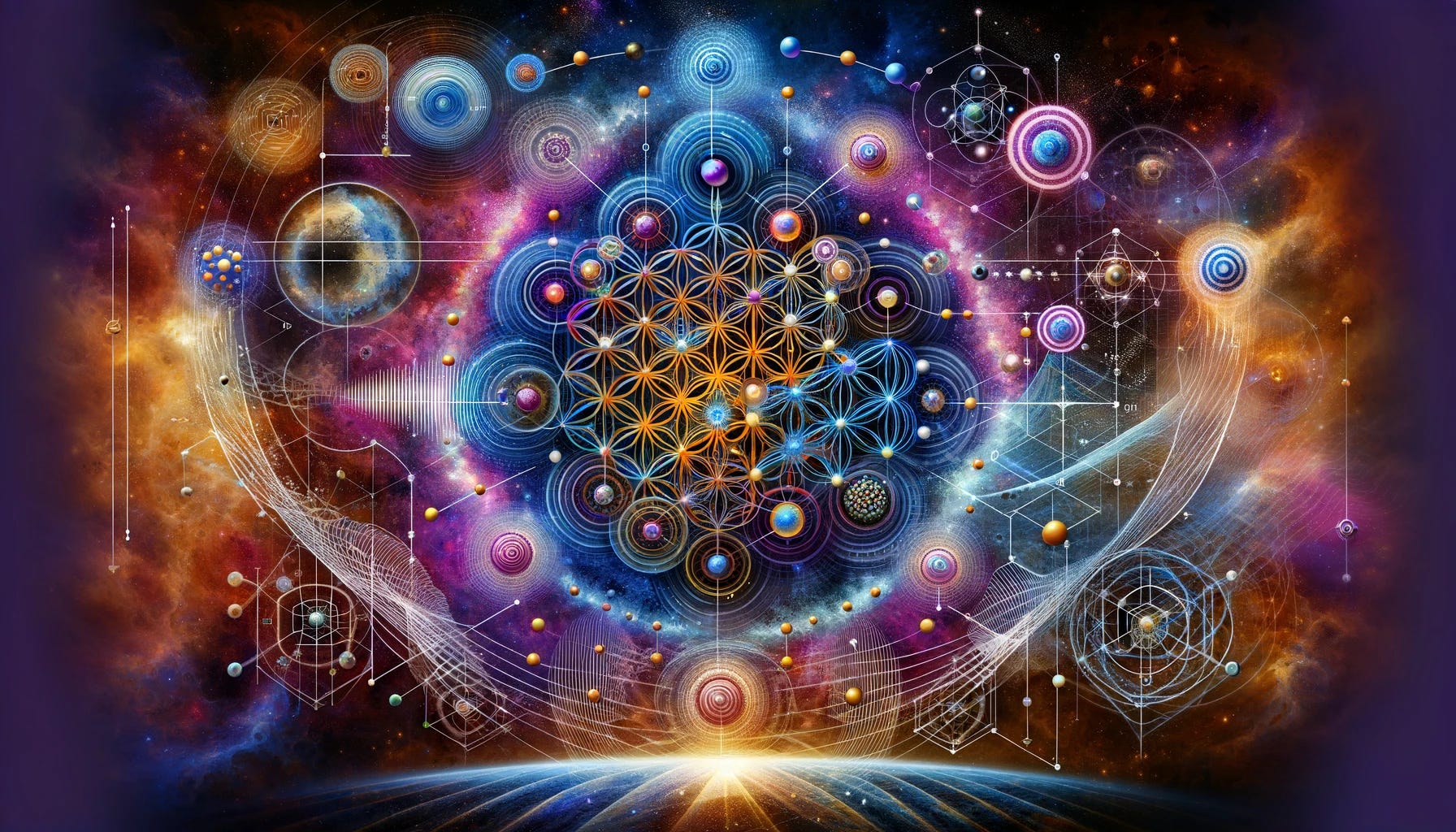 Concept: Expand the Flower of Life pattern to incorporate new elements and structures, using it as a framework to predict and visualize new materials.