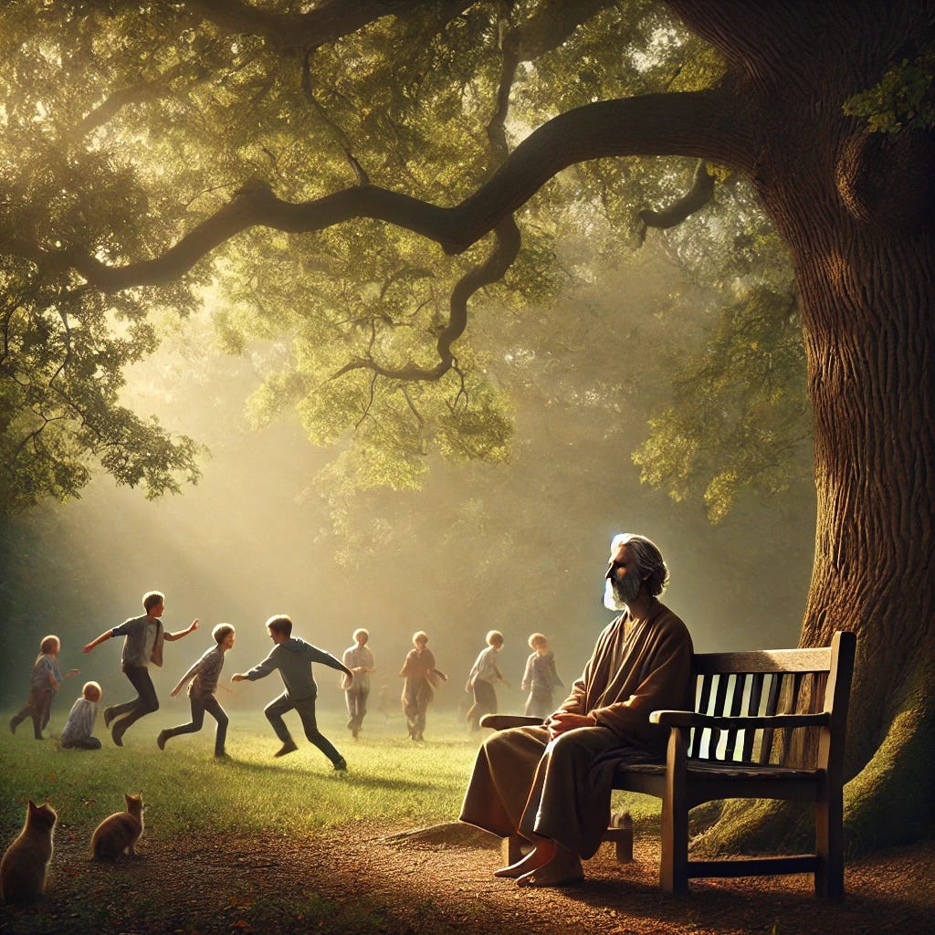 14.1 Mark sat on a bench beneath a sprawling oak tree, its branches like arms stretched in prayer. Around him, nature hummed its quiet hymn: the rustle of leaves, the chatter of birds, and the distant laughter of children playing.